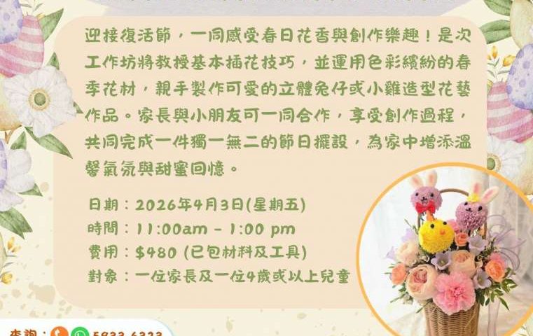 迎接復活節,一同感受春日花香與創作樂趣!是次工作坊將教授基本插花技巧,並運用色彩繽紛的春季花材,親手製作可愛的立體兔仔或小雞造型花藝作品。家長與小朋友可一同合作,享受創作過程,共同完成一件獨一無二的節日擺設,為家中增添溫馨氣氛與甜蜜回憶。